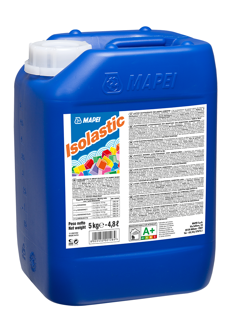 Latex zvyšující pružnost pro smíchání s KERABONDEM, KERABONDEM T, a ADESILEXEM P10. KERABOND smíchaný s Isolasticem vytváří vysoce deformovatelné lepidlo s prodlouženou dobou zavadnutí (C2E/S2). Smícháním KERABONDU, KERABONDU T nebo KERABONDU PLUS s ISOLASTICEM vznikne vysoce deformovatelné lepidlo s prodlouženou dobou zavadnutí (C2E/S2). ADESILEX P10 smíchaný s ISOLASTICEM (ředěným 1:1 s vodou) vytvoří vysoce deformovatelné lepidlo s prodlouženou dobou zavadnutí (C2E/S1).